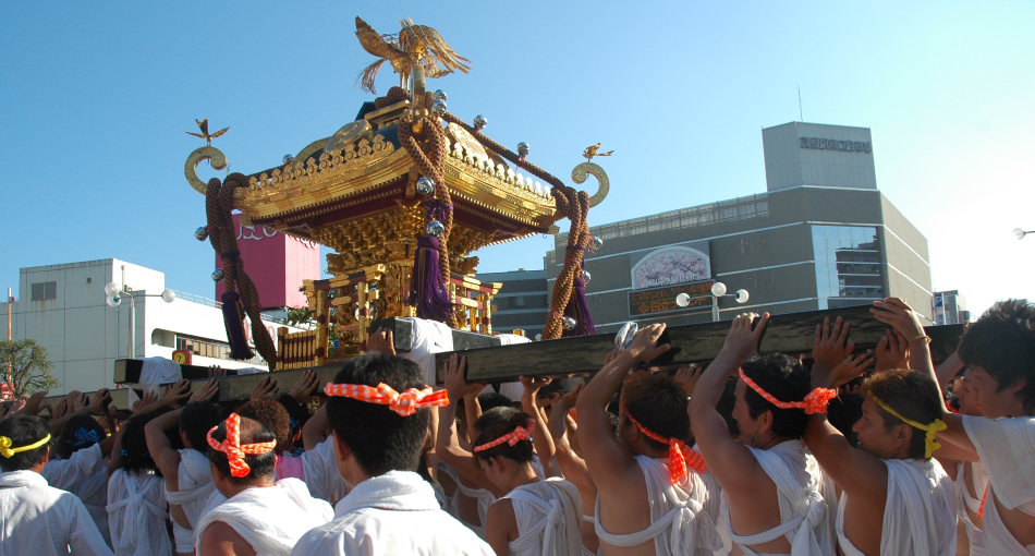 毎年9月中旬に開催される茂原秋まつりは、茂原・高師・中の島地区の神輿5基がJR茂原駅前に集結して激しくもみ合う勇壮なお祭りです。市民はもとより近隣からも多くの見物客が訪れ、茂原市の秋の一大行事となっています。また、神輿を迎え入れる和太鼓の演奏も圧巻で、祭りを盛大に盛り上げます。